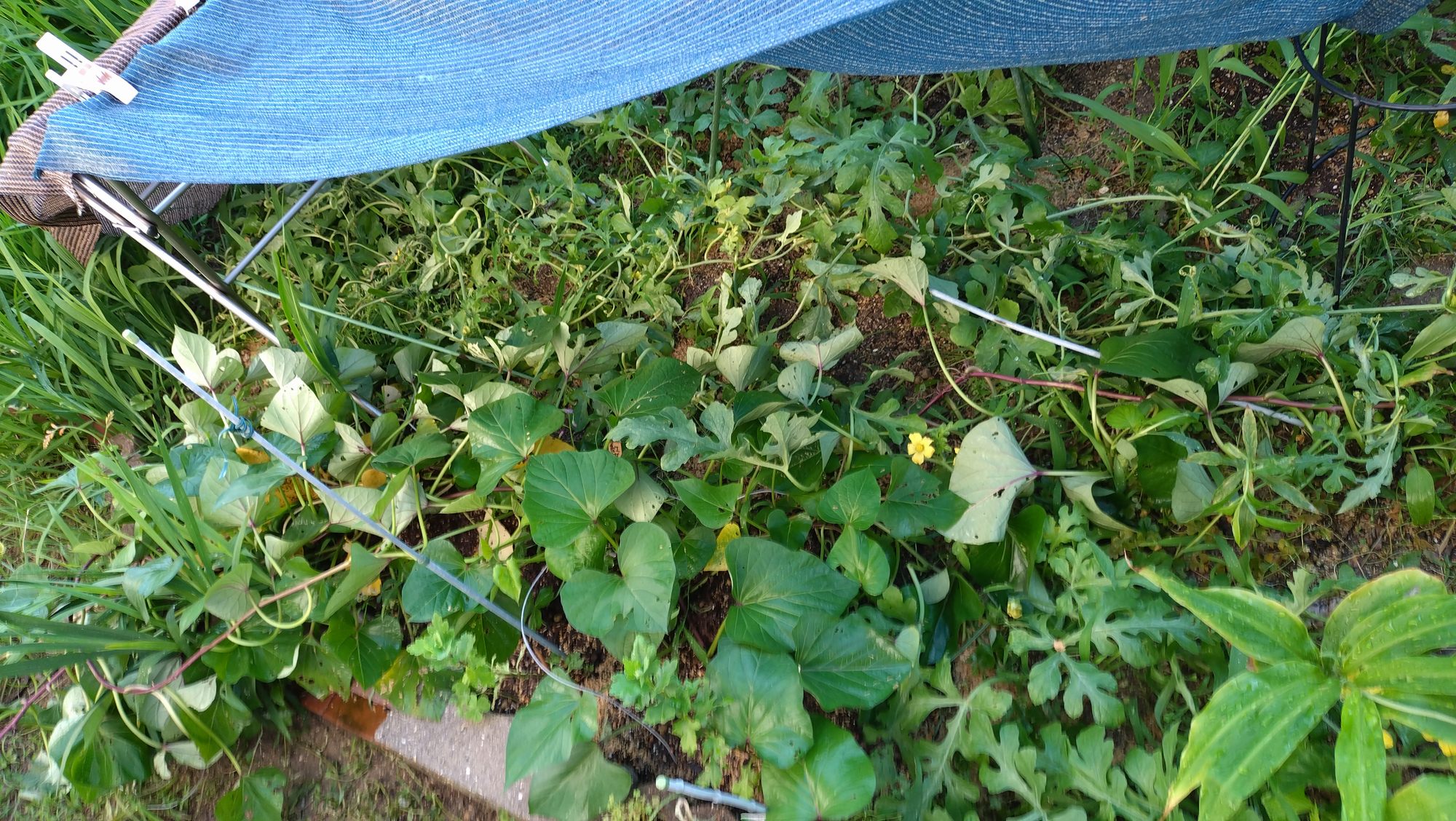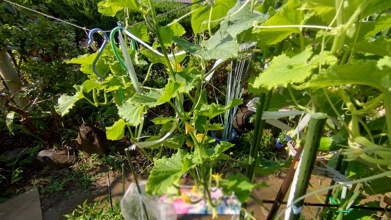 伸びたツルが妙なヒモを伝って、伸びているので、そこまで水分が吸い上げられないのかもしれないです。地面を這わせた方がよかったのかも。