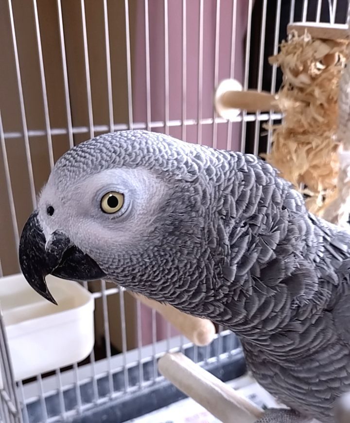 ヨウムは、「ペコチャン」とインコの名前を呼んで返事。