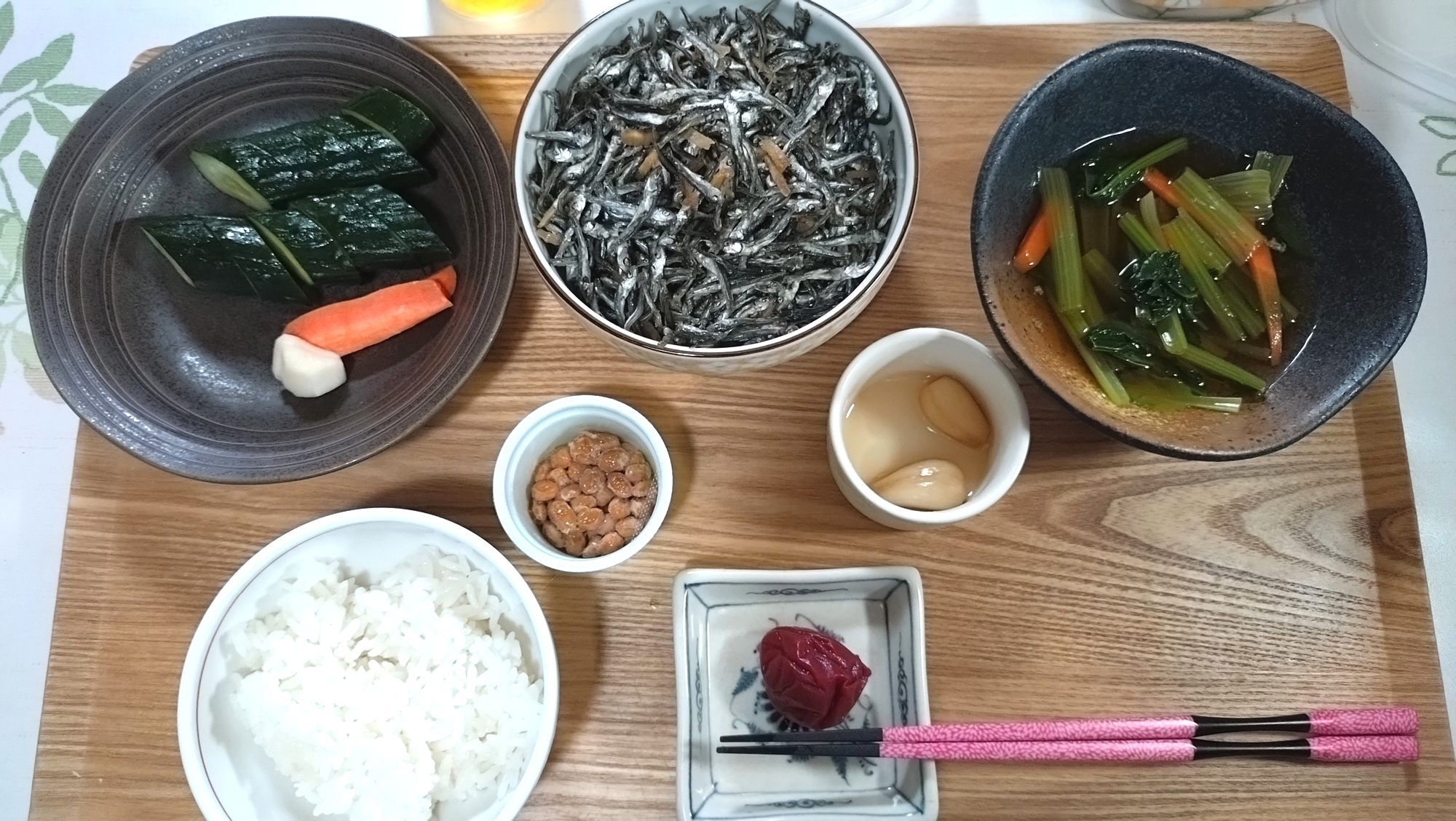 粗食です。残り物と常備菜、並べただけです(*’ω’*)