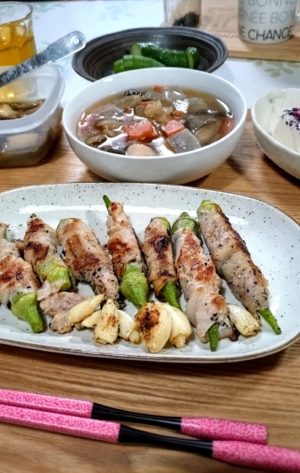 我が家のオクラを豚肉で巻きました。