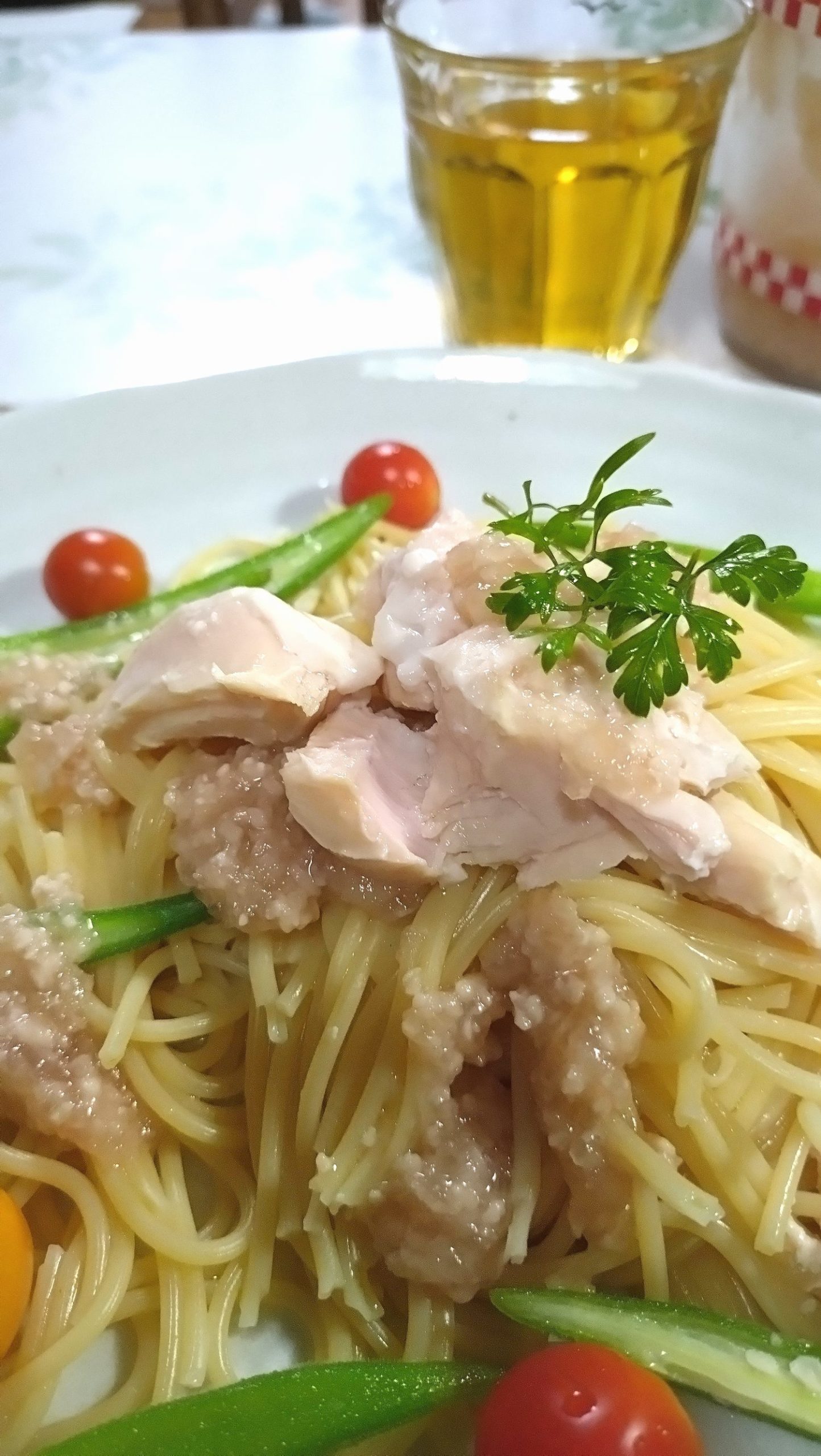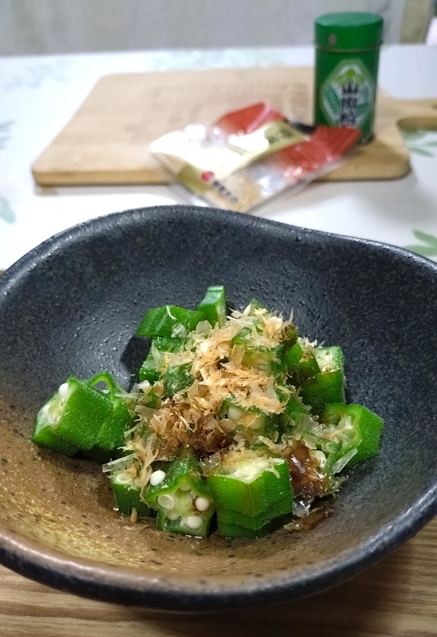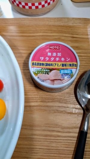缶詰のサラダチキンと茹でオクラと、
