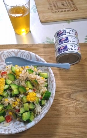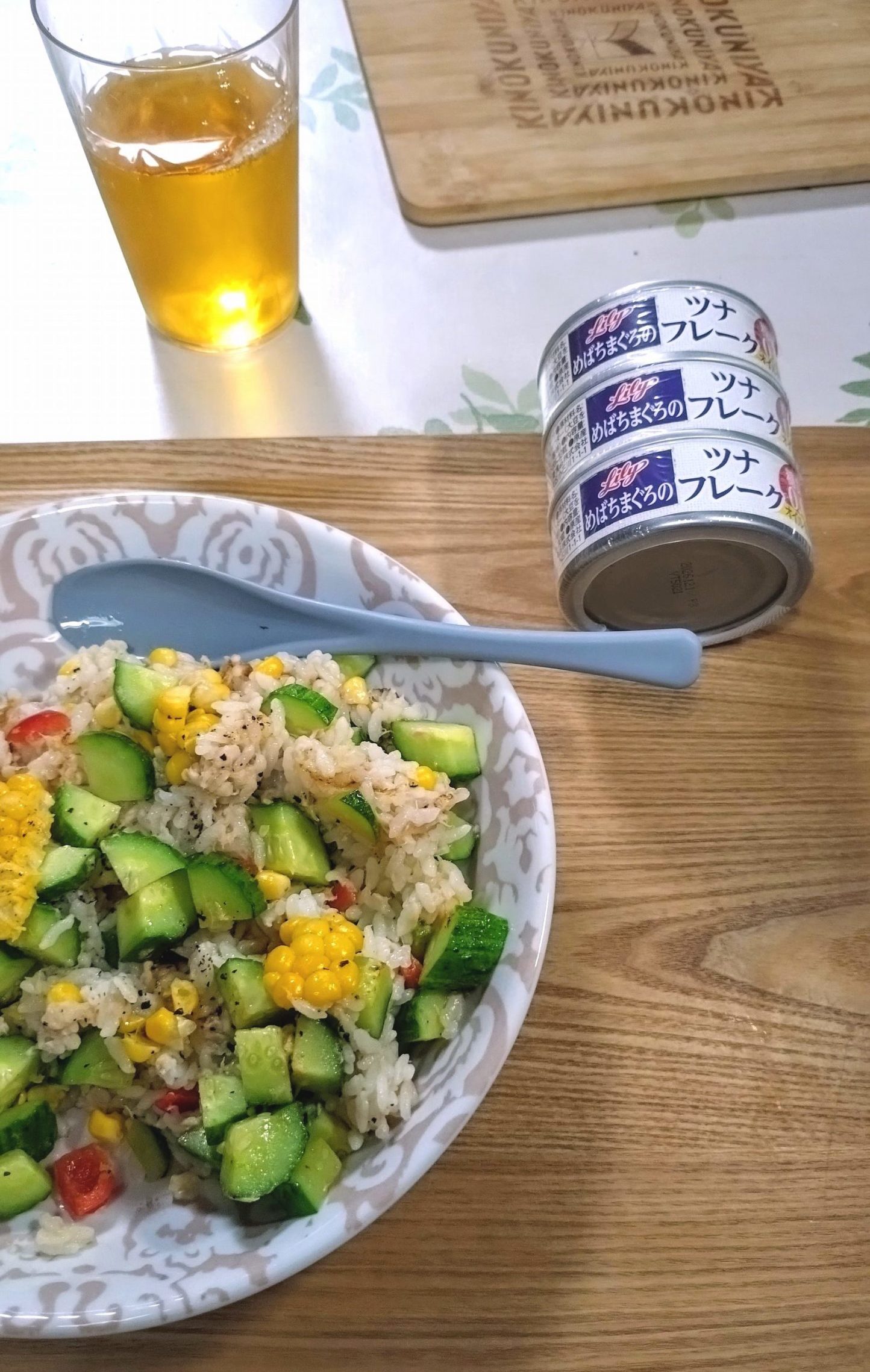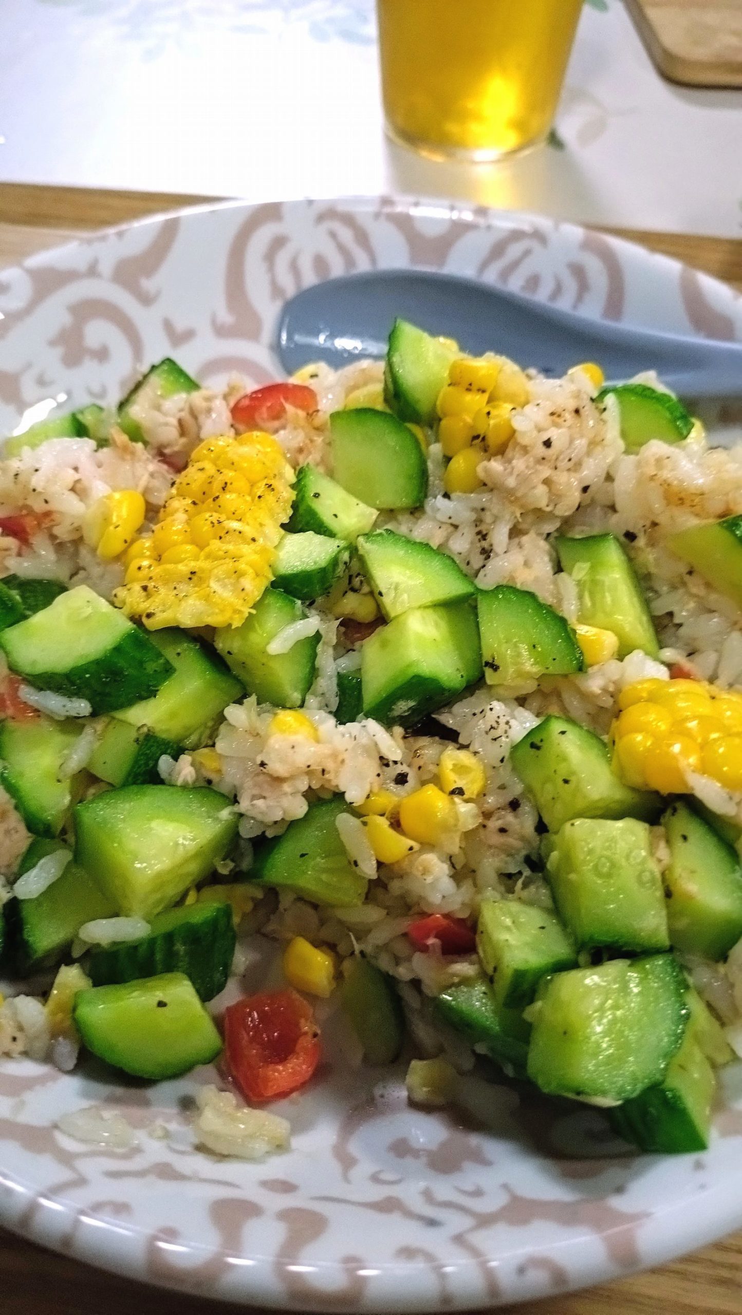 今日のお昼は、早速、頂いたキュウリとコーンで、ピラフにしました。