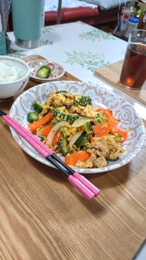 豆腐抜き(腐りやすいので)ゴーヤチャンプルになりました。