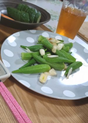 オクラは軽く茹でて置き、オリーブオイルで軽く炒め、途中で、ニンニク投入、
