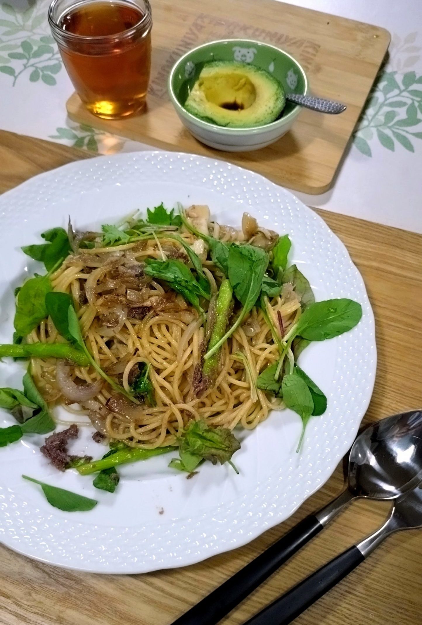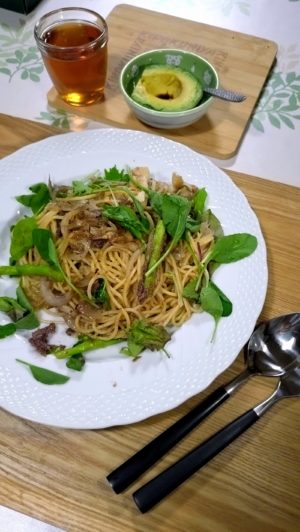 冷凍ごはんもなく、仕方なく、パスタにしました。