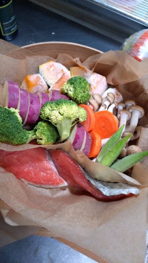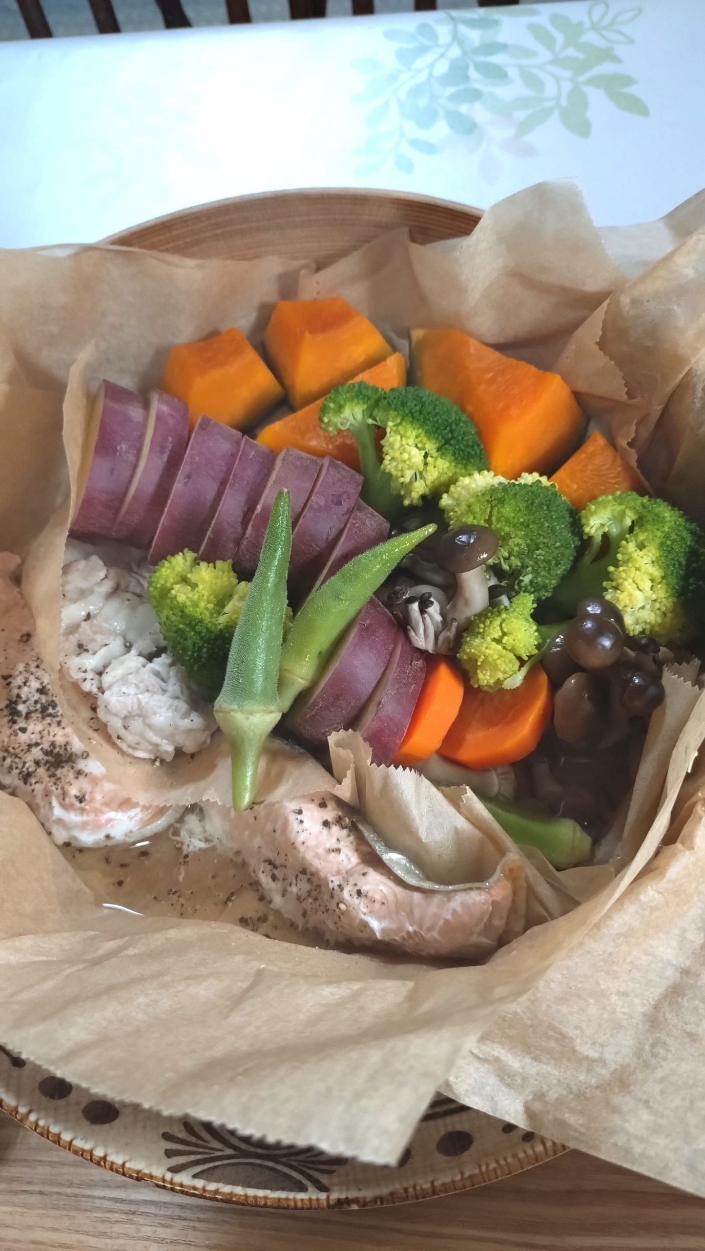カボチャ・ニンジン・キノコ・サツマイモ・ブロッコリー・オクラ・豚肉・秋鮭