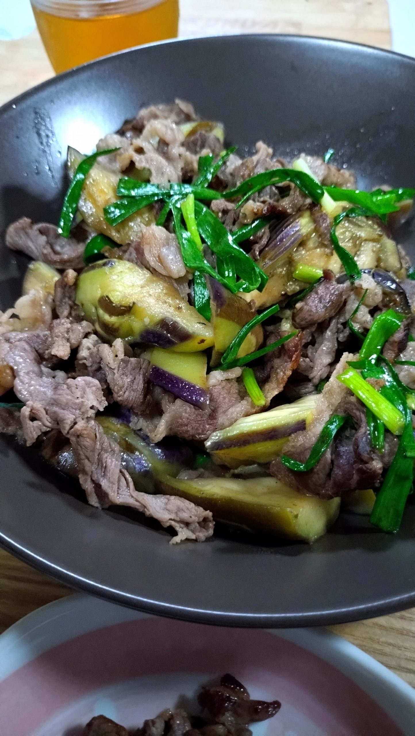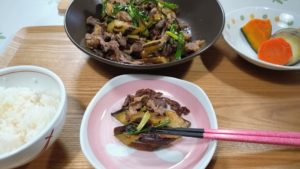 昨日は、ナスとお肉の炒め物にしました。(エノキを入れ忘れました)