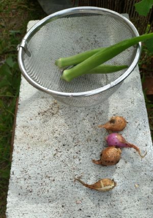今日、南側の雑草取りをしつつ、春先に植えた玉葱を掘り起こすと・・・・