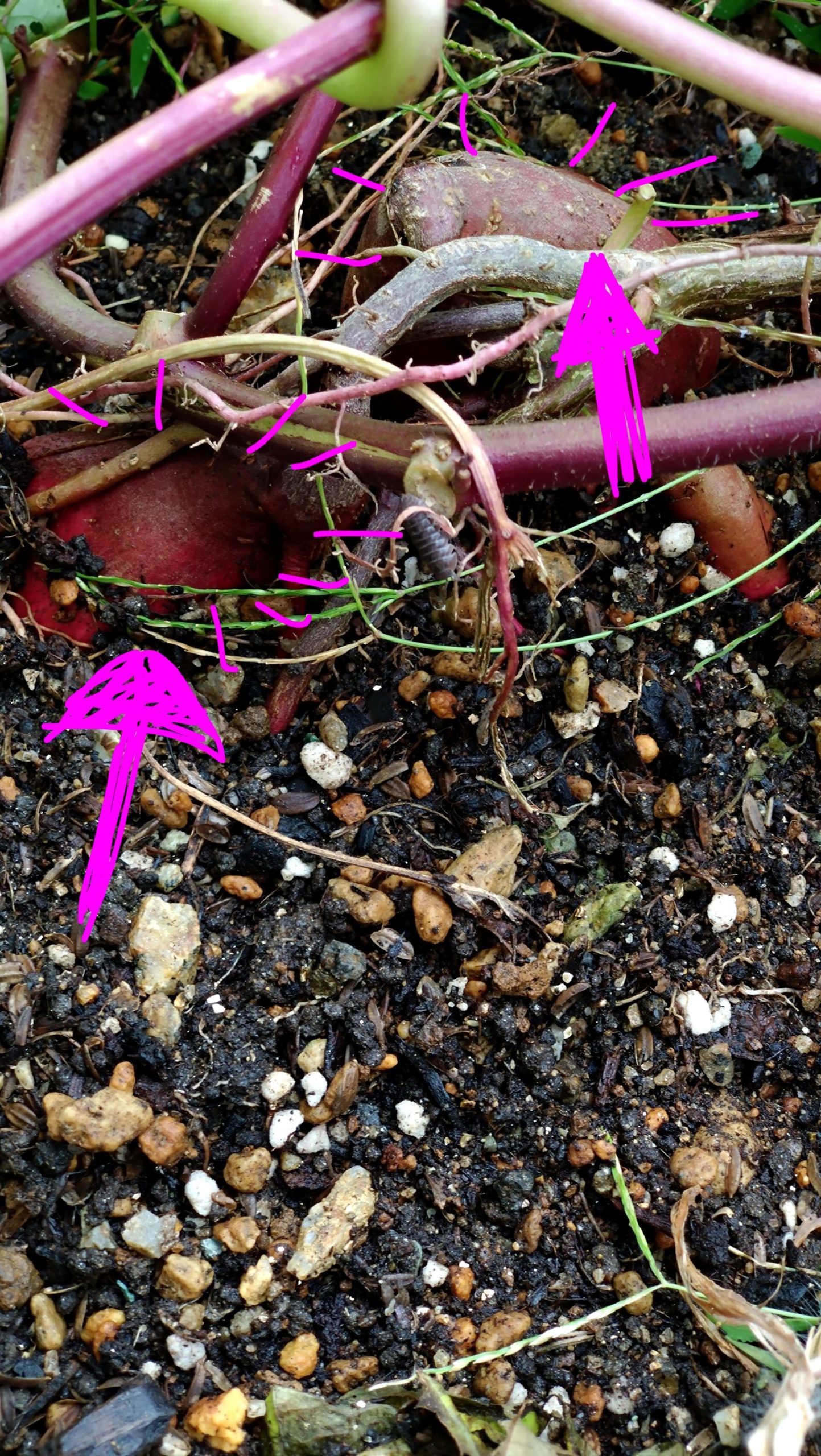 サツマイモの横に植えようと、長く伸びたツルを少し切ったりしていると!!!