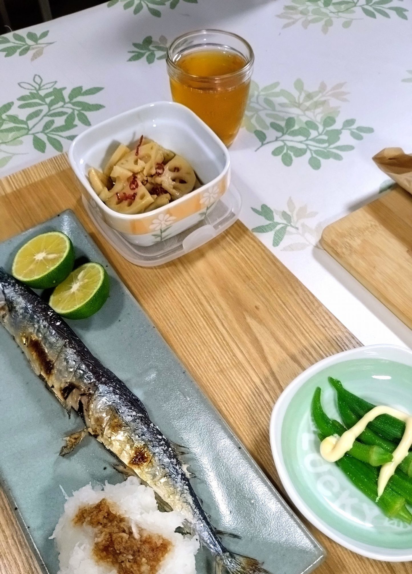 さすがにサンマだけでは寂しいので、自家製オクラと、レンコンのキンピラにしました。