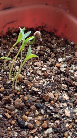 我が家のニューフェース!可愛い子です。種を頭につけたまま、伸びています(^v^)