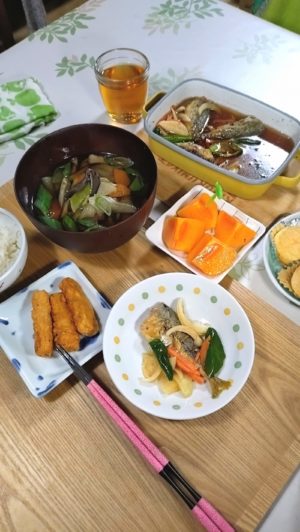 晩ごはんは、小アジのマリネと秋川牧園の冷凍食品と、メインのゴボウ汁。