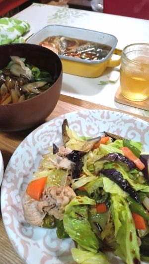 ナスの残りとで、野菜炒め、小アジのマリネ、ゴボウ汁