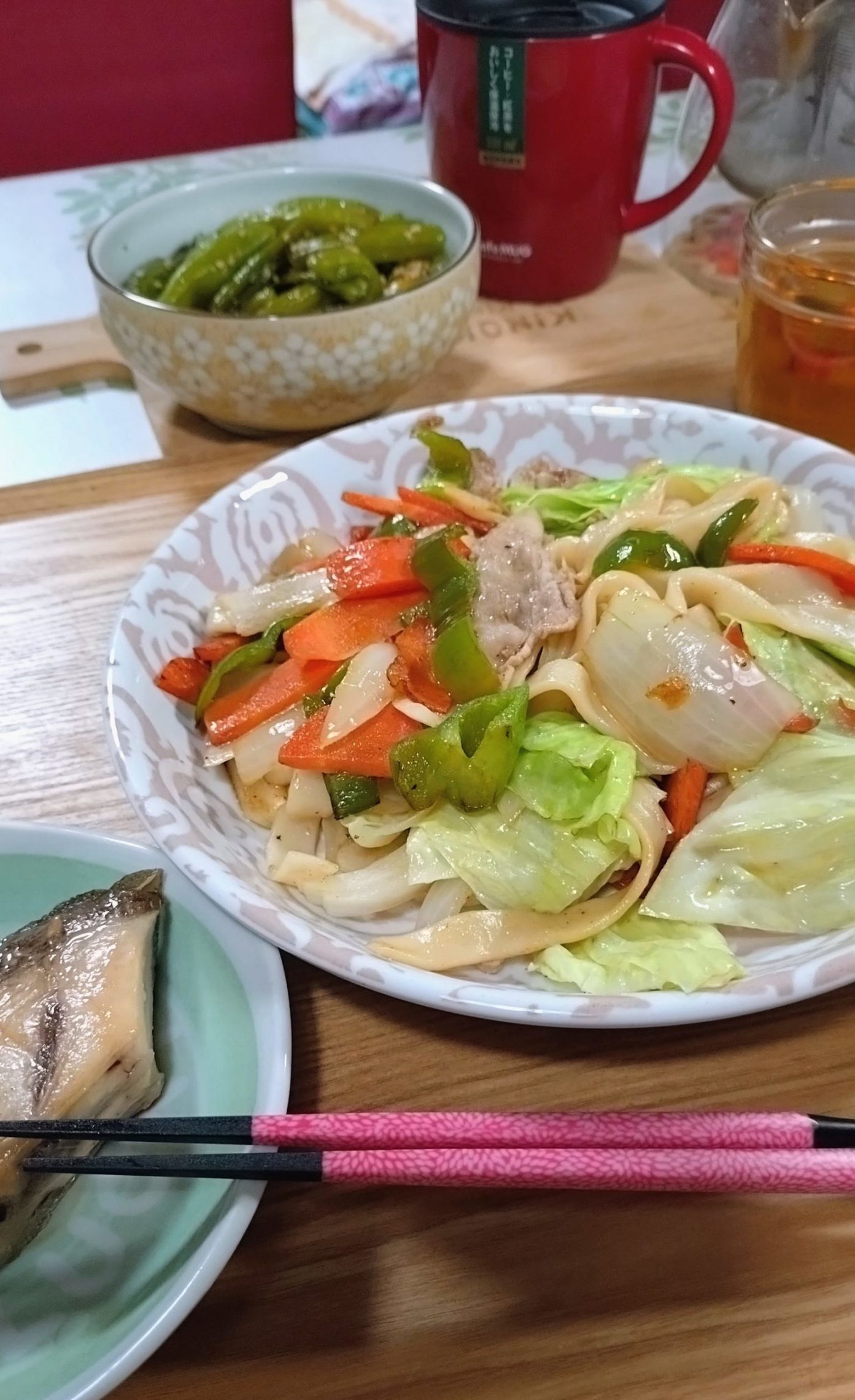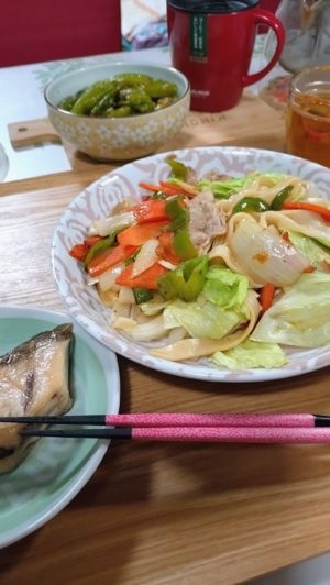 昨日は焼きうどんにしました。味つけは、白だしと、三河みりん、めんつゆだけ。