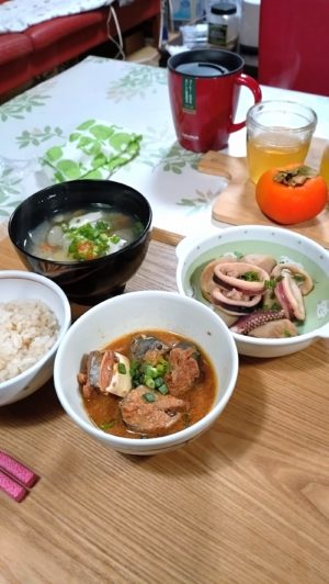 前日の残り物が多かったので、何も作らず、災害備蓄のアイコちゃんの鯖の味噌煮をいただきました。