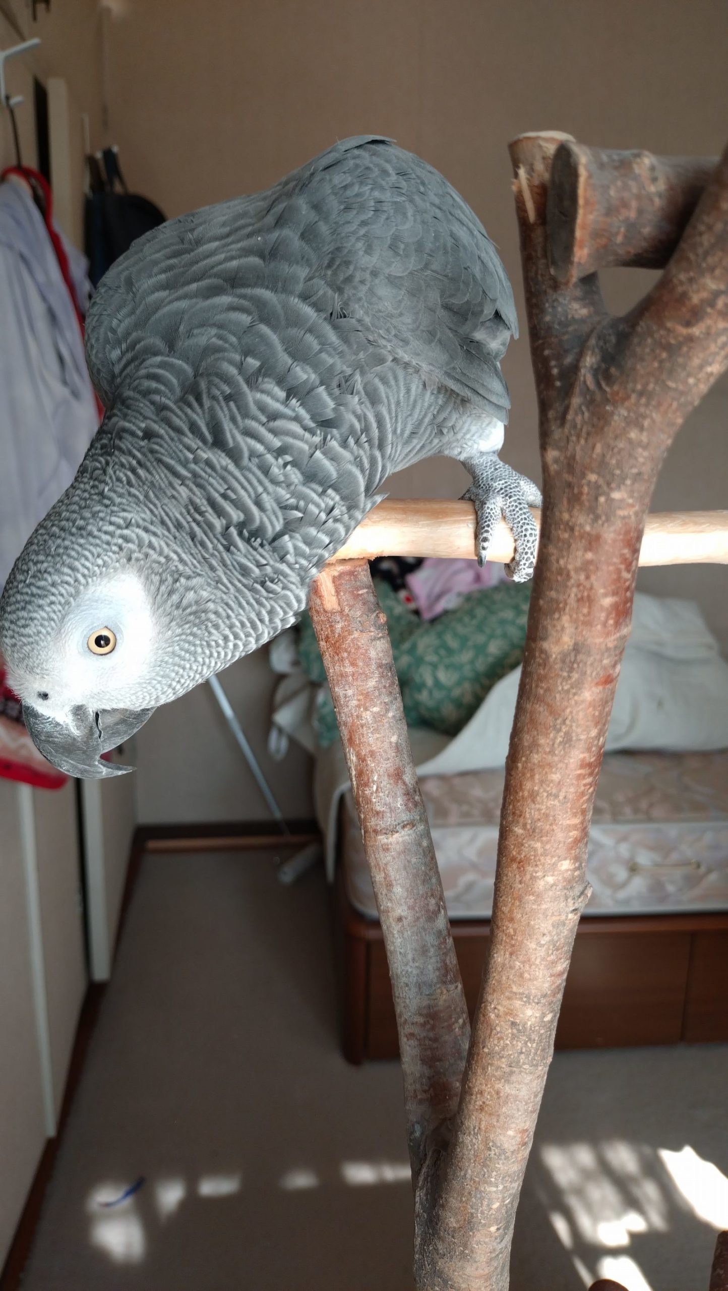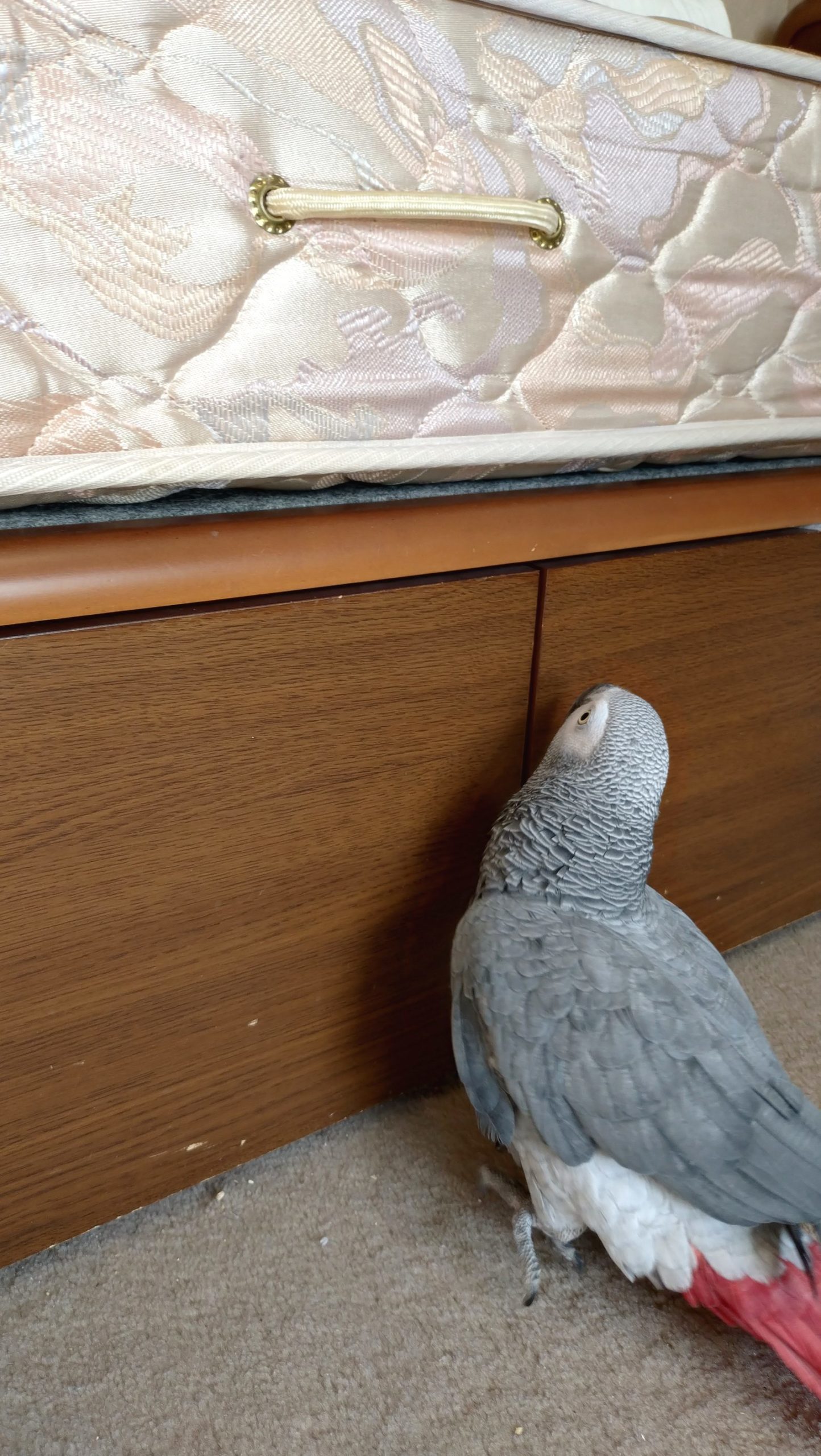 ベッドの上に乗りたいヨウムです。嘴をひっかけるところを探しています。