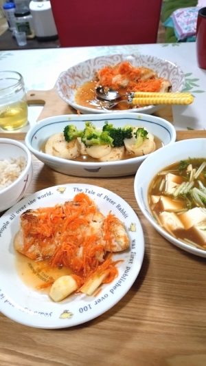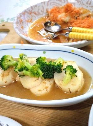 長芋を軽く焼いて、出汁で煮て、あんかけにしました。