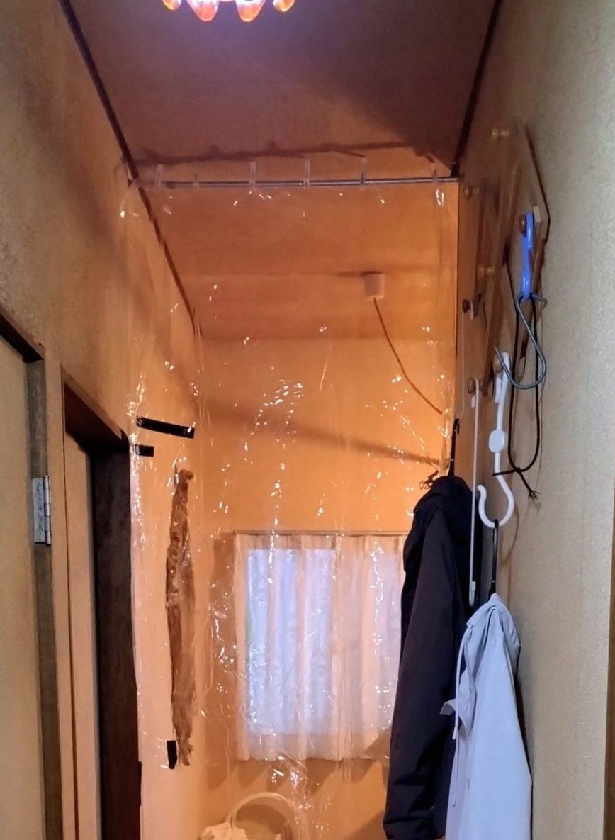 玄関の廊下にツッパリ棒をつけて、透明ビニールクロスを洗濯ばさみで止めて、