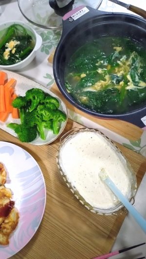 生野菜と鶏スライスのピカタ、ホウレンソウの卵とじのごはんでした。