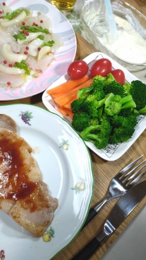 ポークチャップと、先日の人気トップのドレッシングで野菜をたくさん食べました。