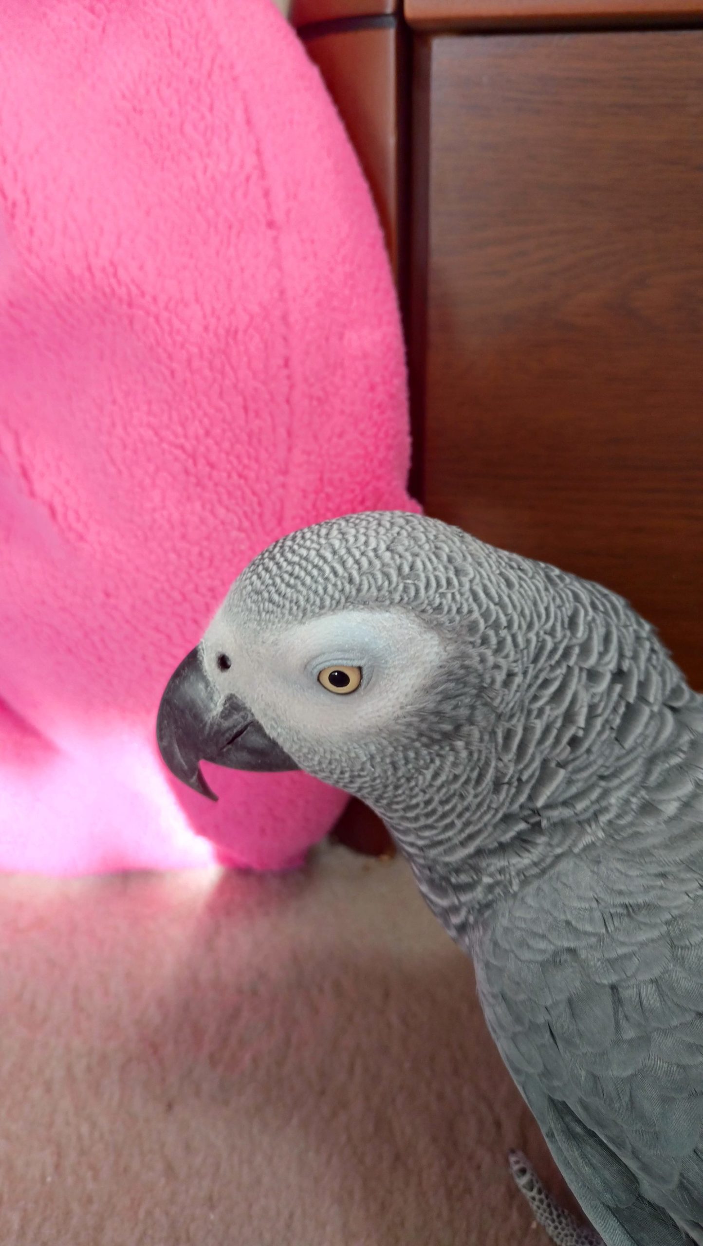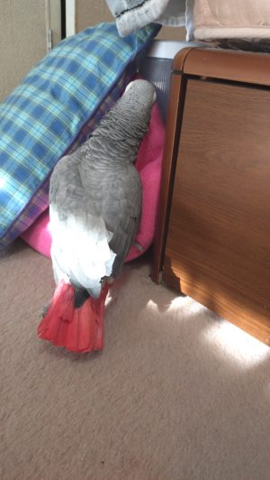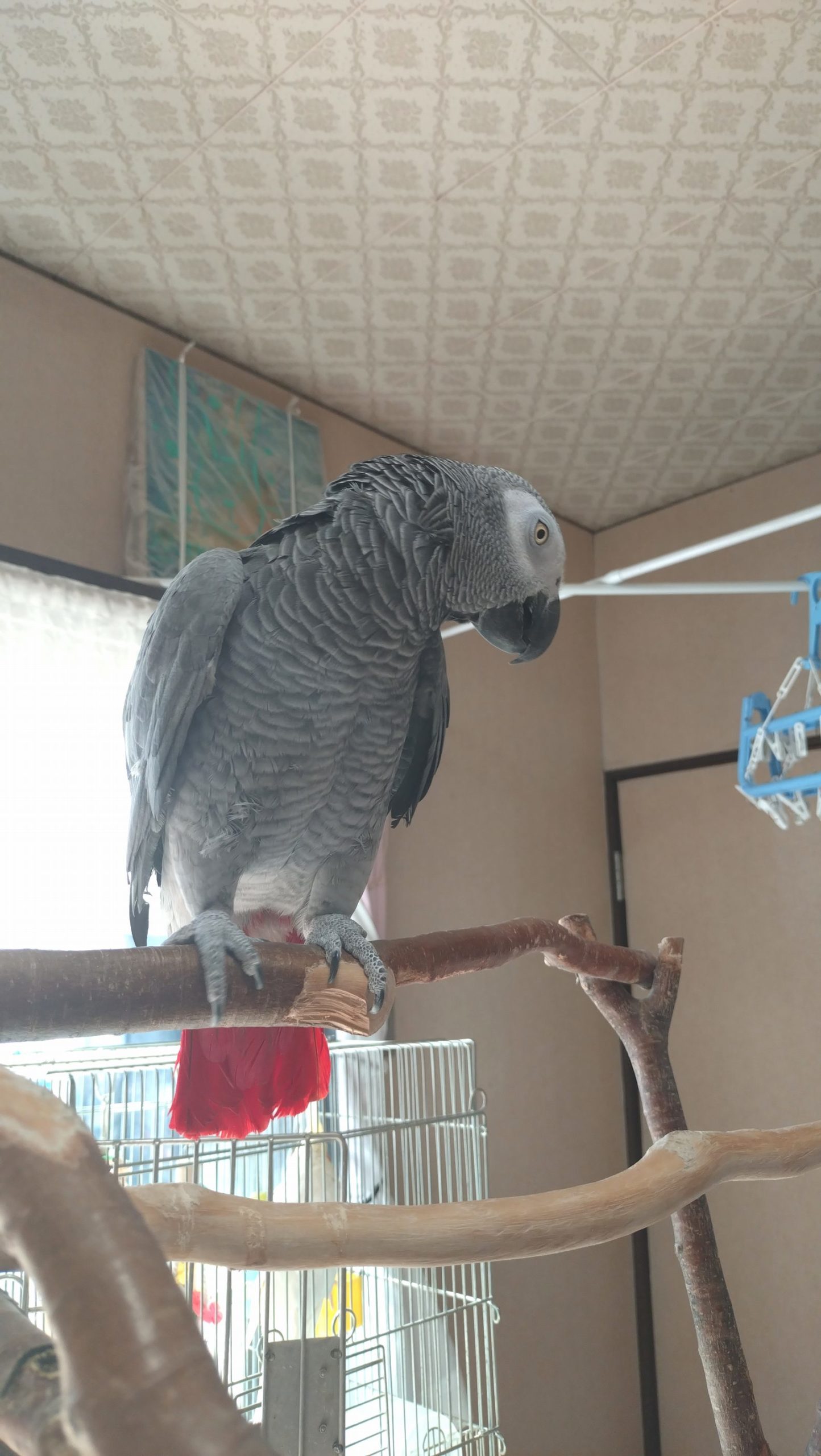 今日は、ポカポカ暖かったので、ヨウムが外に出たがるので、止まり木に。