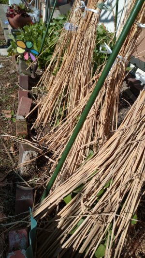 去年は、豆の芽をヒヨドリに食べられたので、飛んで来る空路の侵入場所に、