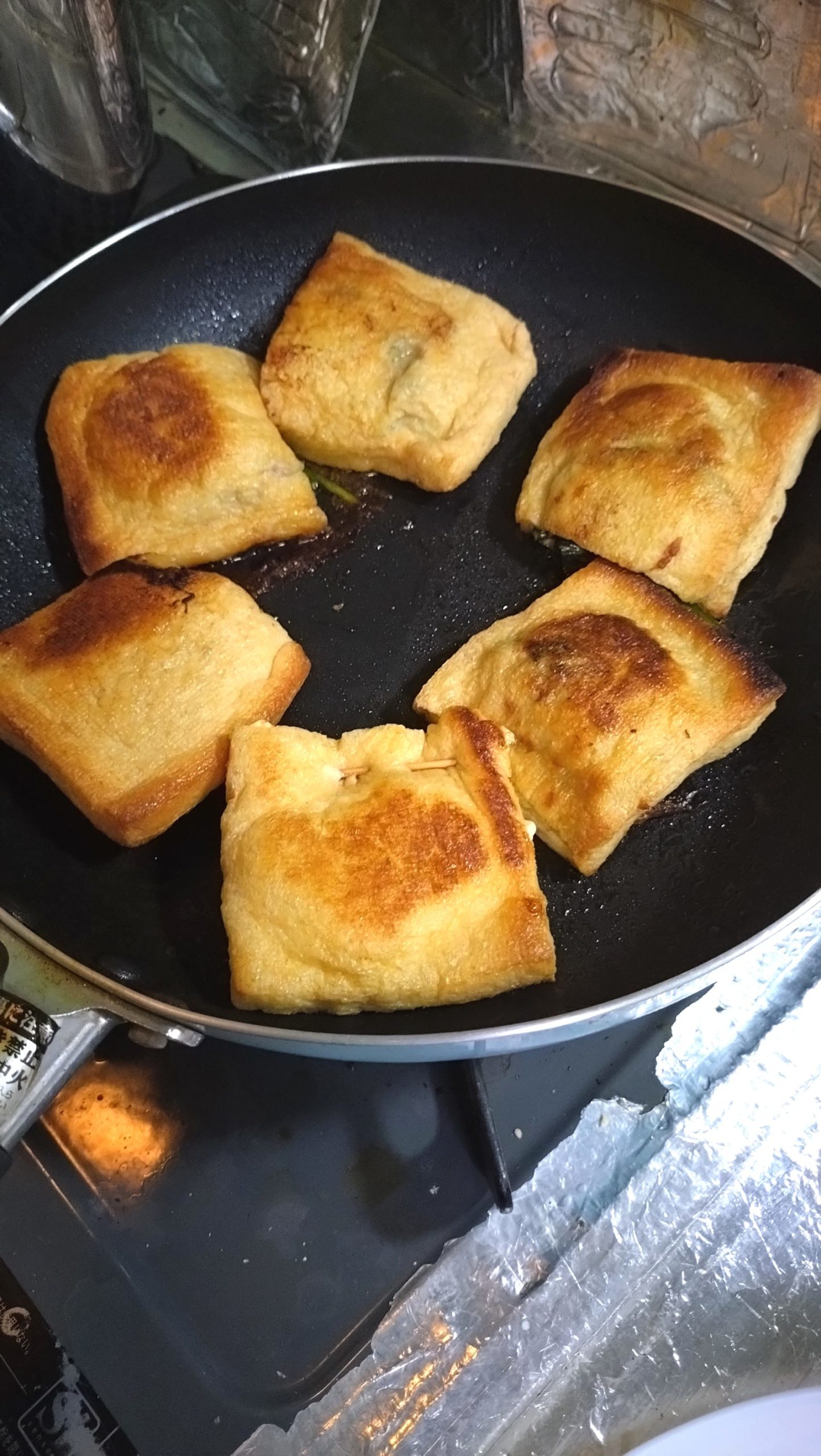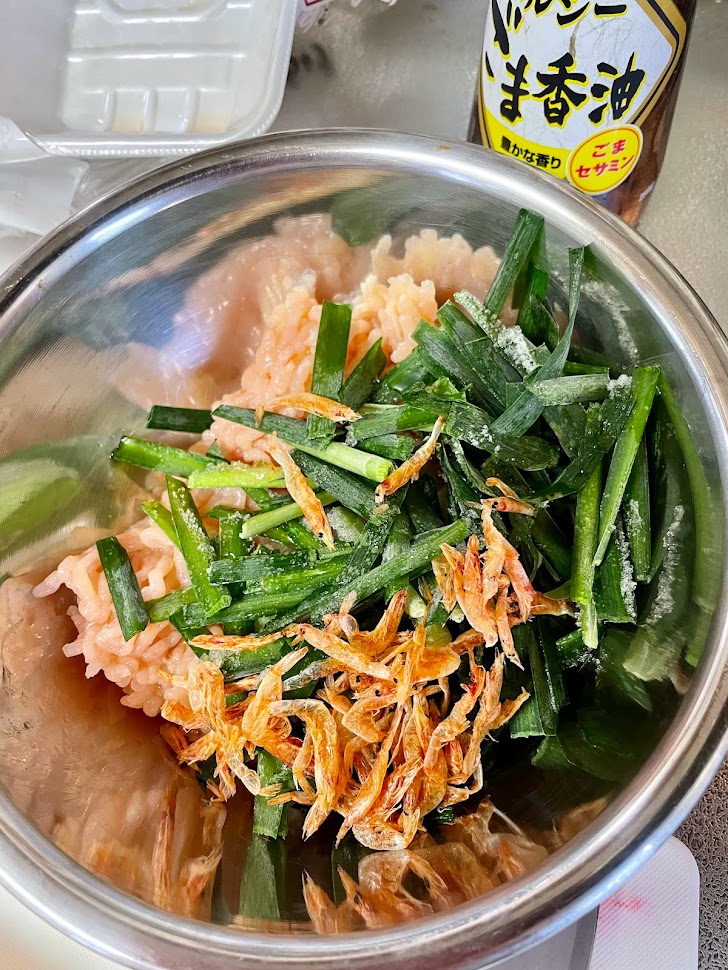 豚ひき肉、ニラ、干しエビ、ゴマ油を詰めて、