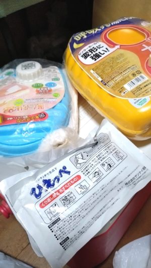 湯タンポは、冬の災害時に(寝袋に入れても)役立つので、数種類のサイズで備蓄。