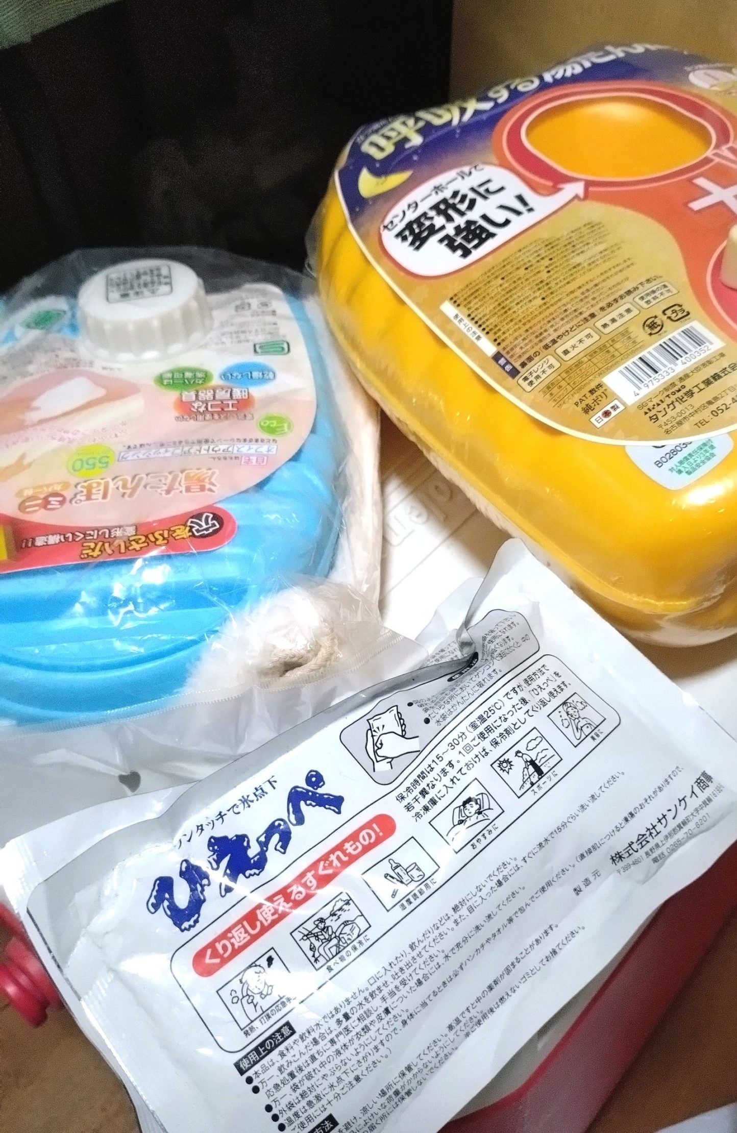ガツンと叩くと、一瞬で冷える保冷剤や、湯タンポも出てきました。