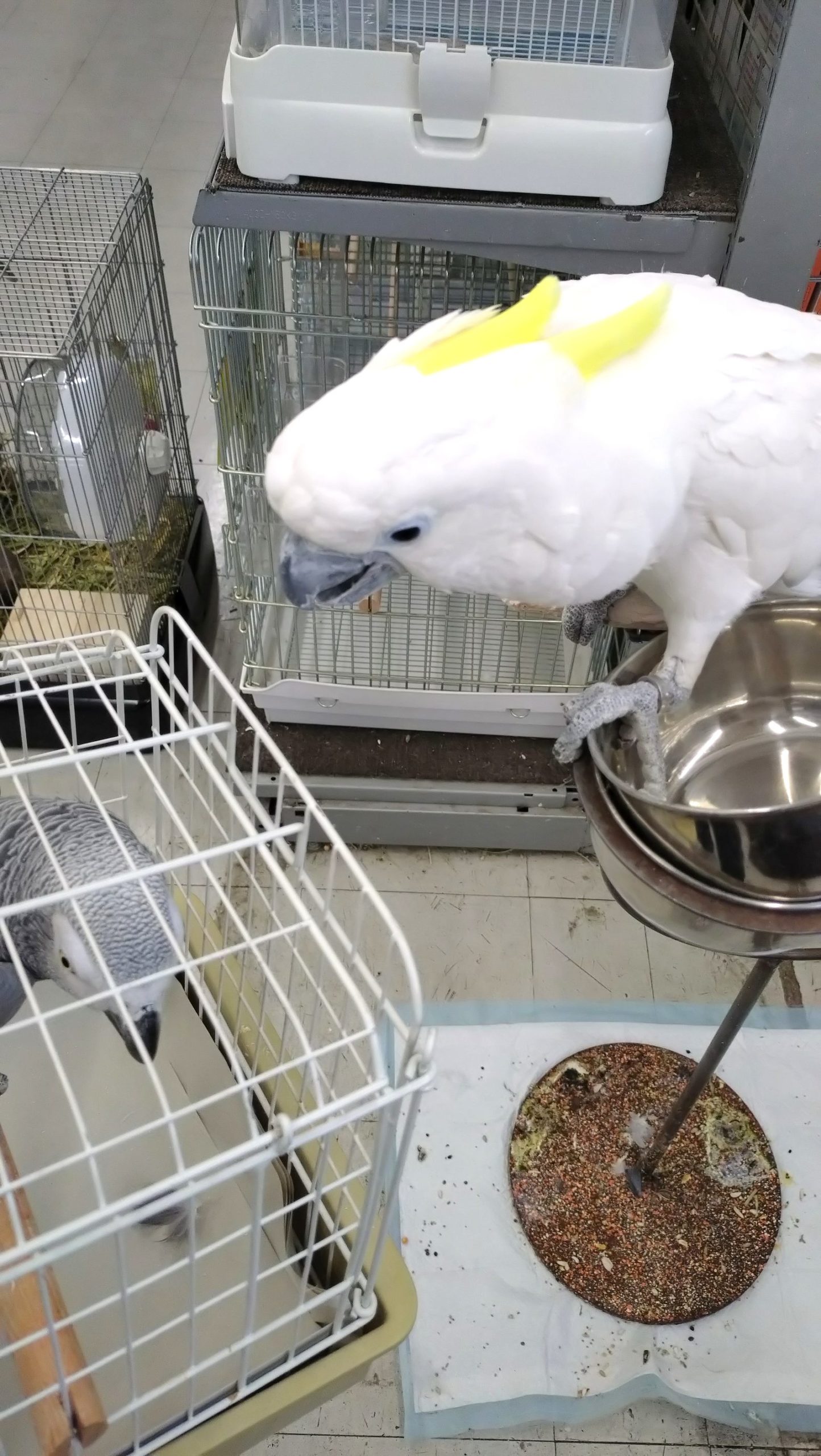 ヨウムに興味があるようでしたが、うちの子は怖がりなので、ビビってました。