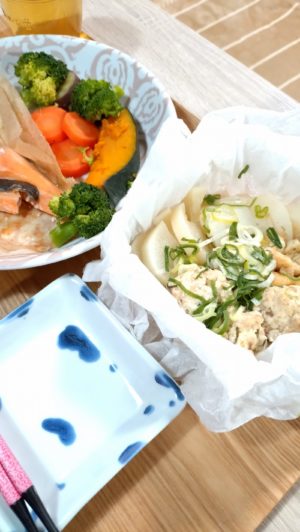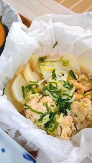 「前日から、生姜とネギを白だしとお酒に付けて香りを出してから蒸しています」とのこと我が家のへなちょこ大根を、美味しいお料理に仕立ててくれていました。