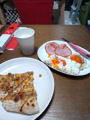 昨日の晩ごはん、ハムエッグとピザもどきだけ。
