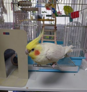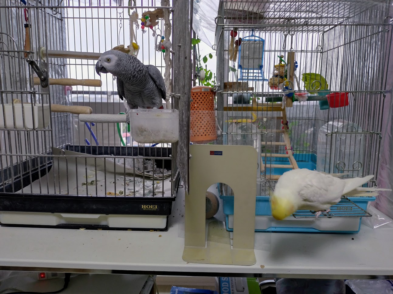 おかめインコは、しっかり、あの平な止まり木が気に入ったようです。