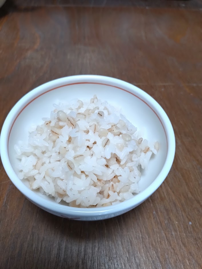 前に分けていただいた白米に、押し麦を入れて食べています。