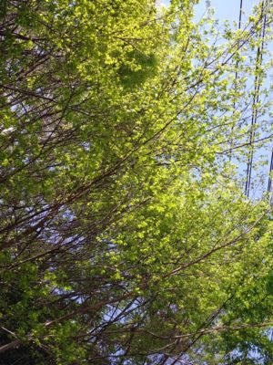 新芽が鮮やかで、ちょうど頭上で、ウグイスが鳴いてたので、