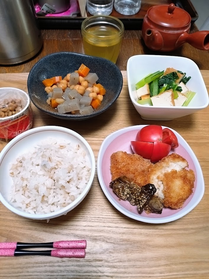 ひよこ豆の五目煮と、厚揚げと小松菜のお浸し、